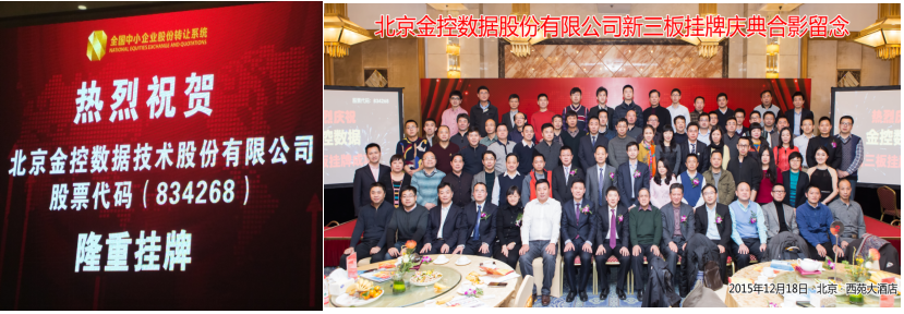 2015年,公司通過股改,正式更名為“北京金控?cái)?shù)據(jù)技術(shù)股份有限公司”,并順利完成新三板掛牌上市。