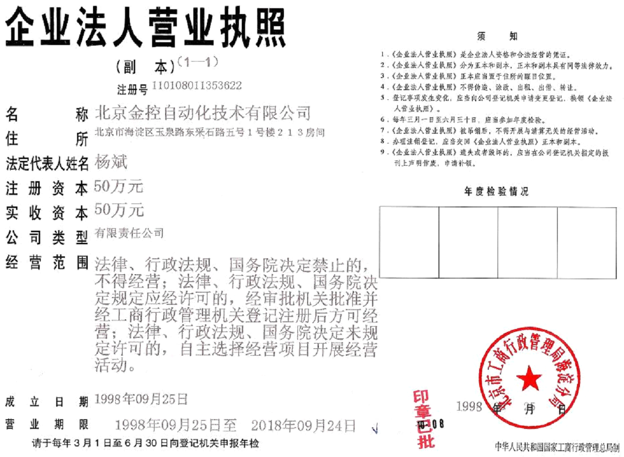 創(chuàng)始人楊斌先生在北京中關(guān)村創(chuàng)立了北京金控自動(dòng)化技術(shù)有限公司,夢(mèng)想從此起航。